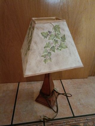 Lámpara de mesa en madera maciza. En perfecto estado. Incluye pantalla de arpillera con volante y lazo verde. Ideal para aparador o mueble de entrada. Altura total con pantalla 61 cm. Altura del pie de madera 41 cm. Diámetro de la pantalla 33 cm.