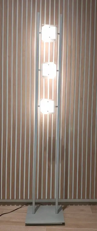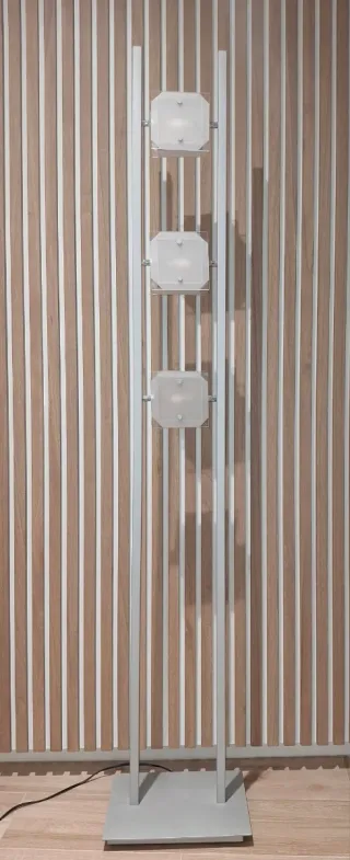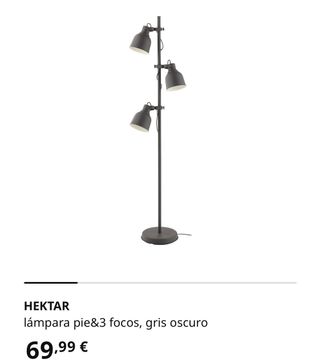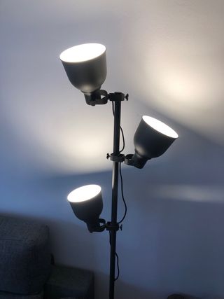 Lámpara de pie de tres focos de color gris oscuro. Comprado en Ikea por valor de 69,99€. La vendo con las tres bombillas incluidas de 8.6W. No realizo envíos, recoger en Rubí. Más mobiliario en mi perfil!!