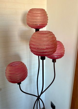 Lámpara de diseño, de pie con 4 luces. Muy bien cuidada. Estilo rústico muy acogedor e ilumina muy bien. Mide como 1,50m. Tiene interruptor, para encender y apagar. En perfecto estado (no incluye las bombillas). Valorada por mas de 100,00€. Se vende por cambio en la decoración.