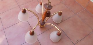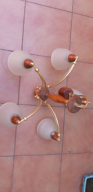 Lampara de techo dorada con adornos de madera