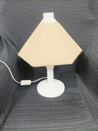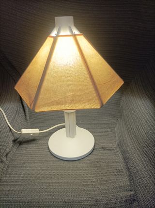 Preciosa lampara de mesa, ideal para una mesita de noche o escritorio. Se encuentra en muy buen estado. - Pantalla de tela beige. - Base y pie de plástico y madera blanca. - Interruptor en el cable.