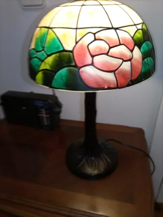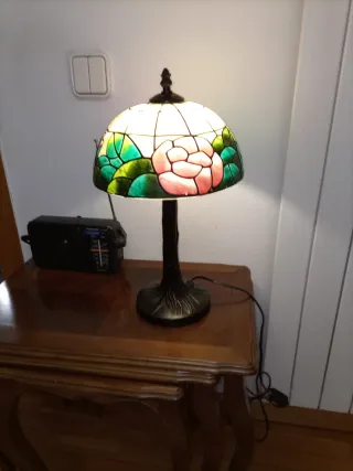 Elegante lamparilla de mesa con un diseño inspirado en el estilo Tiffany. La pantalla está elaborada con piezas de cristal y metal, creando un efecto visual único. - Pantalla con diseño floral en tonos verdes y rosas. - Base y pie de metal con detalles ornamentales. No envío Tecoger en domicilio