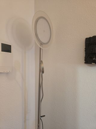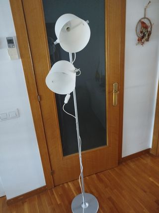Bonita lámpara de pie halógena para interior. Hasta 300 W. Se encuentra en muy buen estado. - Diseño elegante y moderno. - Perfecta para iluminar cualquier espacio de tu hogar. - Incluye las dos bombillas halógenas puestas y dos de regalo sin usar (repuestos para la luz superior). - La única pega es que la base no está perfecta y hay que afalcarla para que la lámpara quede bien recta