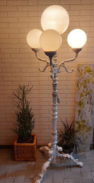Diseño alegre y detalles ornamentales. Nos ha acompañado en nuestras cenas y reuniones en la terraza. Hace tiempo le hicimos un "apaño", y colocamos un interruptor en el cable, por comodidad, y funciona perfectamente. La hemos usado como luz en el recibidor e incluso como perchero también muy útil. Pero ya es hora de despedirnos de ella por falta de espacio. - Base y estructura de metal con acabado blanco. - Globos de cristal blanco difusor.