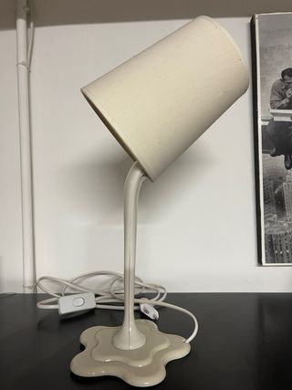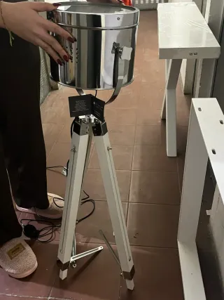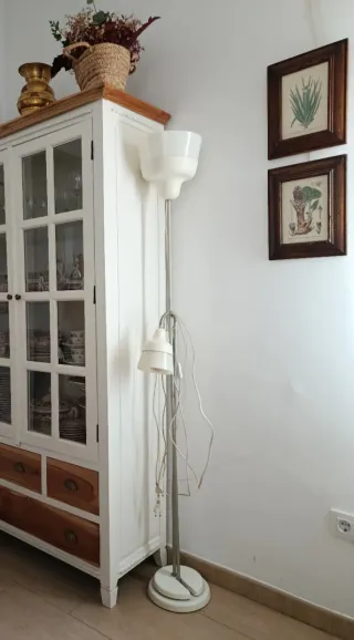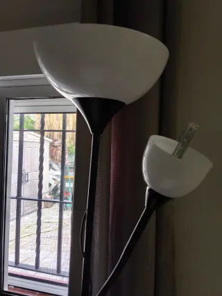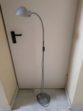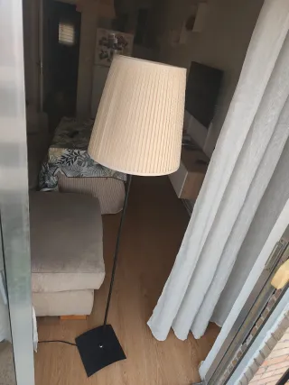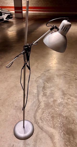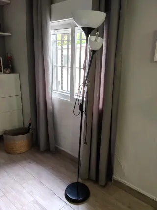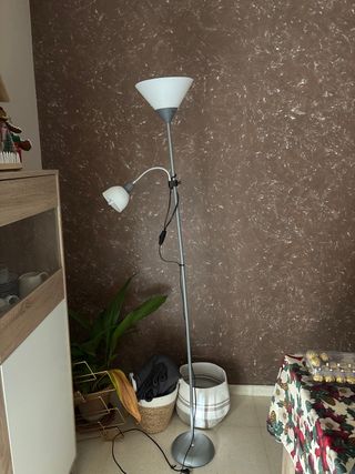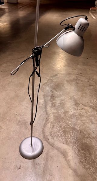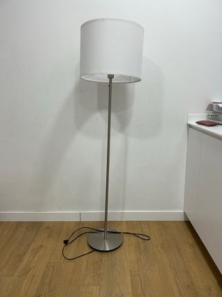 Lámpara de pie de Ikea con un diseño moderno y elegante. - Acabado en metal y plástico. - Color plateado y blanco.Medida de altura 1'75 cmt. Incluye bombillas. Solo tiene un poco tomado el color de la plataforma de abajo( adjunto foto) casi no se le ha dado uso