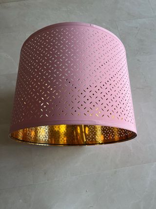 Conjunto de dos pantallas para lámparas, una de color negro (para lámpara de pie) y otra rosa con un diseño calado de grandes dimensiones para colgar. - Pantalla cónica negra con interior blanco. - Pantalla cilíndrica rosa con interior dorado y diseño perforado.