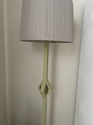 Elegante lámpara de pie con un diseño moderno. - Pantalla de tela plisada en tono gris. - Base y estructura de metal pintada en color verde oliva. - Como nueva, en excelente estado.