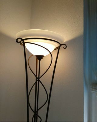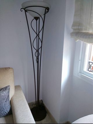 Elegante lámpara de pie con un diseño de forja en tono marrón. Su pantalla de cristal aporta un toque de distinción. Ha estado en una habitación usada de salita donde nunca había nadie, se ha encendido un par de veces. - Estructura de metal con detalles curvos. - Pantalla de cristal esmerilado.