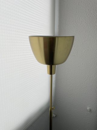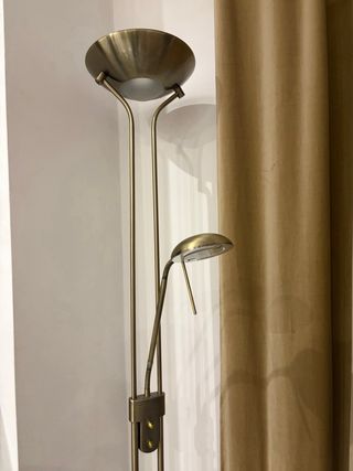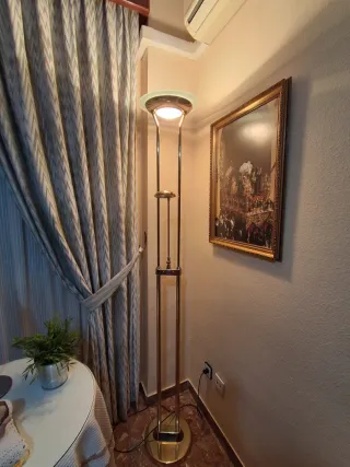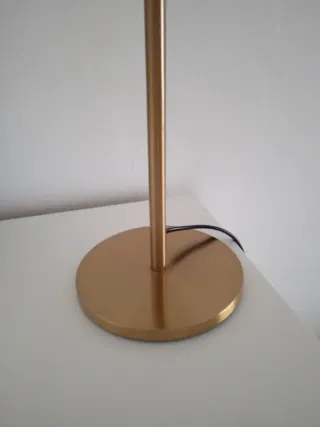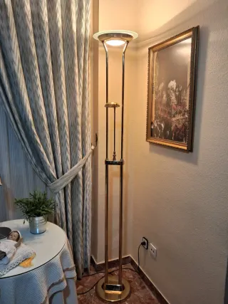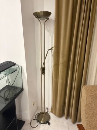 Elegante lámpara de pie con acabado dorado. - Diseño moderno y funcional. - Base redonda y estable. - Brazo ajustable para luz direccional. - Luz de arriba graduable Tiene algún desgaste del color en la zona de regulación de la luz Medidas altura 180 cm, base 27 cm