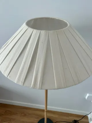 Elegante lámpara de pie con un diseño moderno y materiales de calidad. - Pantalla plisada de lino. - Base y pie de madera.