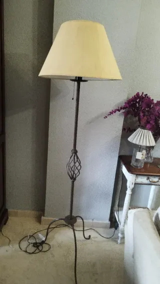 Elegante lámpara de pie con un diseño rústico que aporta calidez a cualquier espacio. Su estructura de metal y pantalla de tela crean un ambiente acogedor. - Base de metal con patas. - Tulipa de tela en tono amarillento. - Detalle decorativo en espiral en el pie.