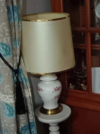 Elegante lámpara de pie con base de porcelana y detalles metálicos. - Pantalla de tela color marfil. - Base de porcelana con delicado diseño floral. - Adornos metálicos en color dorado.