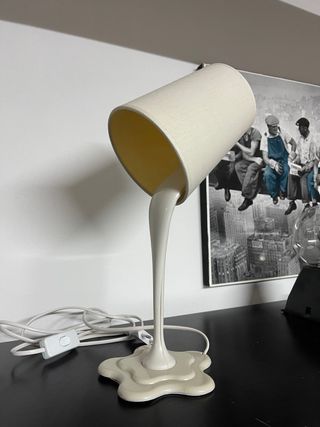 Original y moderna lámpara de mesa con un diseño divertido que simula un derrame de pintura. - Pantalla de tela. - Base y pie de plástico.