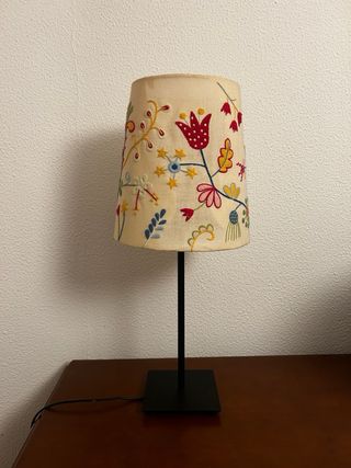 Pantalla de lámpara con un encantador diseño bordado de la colección Alfhild Fägel de Ikea descatalogada. Presenta un patrón de flores y pájaros. Inlcuye pie de lámpara en color negro. - Diseño floral y de pájaros. - Bordado detallado. Sólo venta en Sevilla.