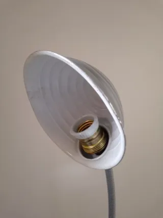 Lámpara de pie de diseño moderno, perfecta para cualquier rincón de tu hogar. - Acabado en metal plateado. - Base circular estable. - Brazo flexible para dirigir la luz.