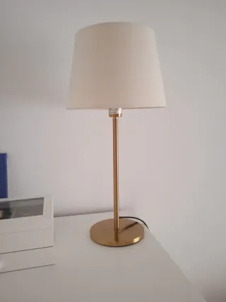 Elegante lámpara de mesa con un diseño moderno. - Pantalla de tela en color blanco - Base y pie de metal en acabado dorado.