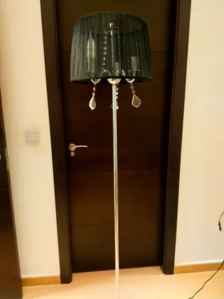 Lámpara de pie con un diseño moderno y sofisticado, perfecta para añadir un toque de estilo a cualquier estancia. - Pantalla de tela negra. - Detalles decorativos de cristal. - Base y pie de metal plateado.