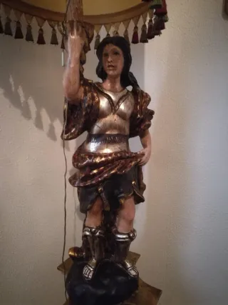 Pie de lámpara con una figura decorativa y su base. - Figura con armadura. - Base de madera y metal.