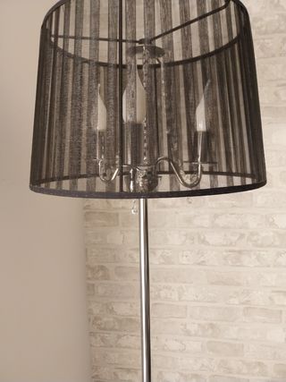 Elegante lámpara de pie con un diseño moderno. Se vende con las 3 bombillas en forma de vela. - Pantalla de tela con acabado en negro. - Estructura metálica brillante. - Tres puntos de luz.