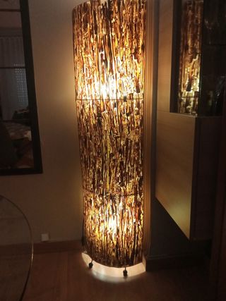 No funciona. No se si hay que cambiarle el cable o el interruptor. Color dorado y negra, la pantalla es preciosa y la luz que da es fantasía total! Puede usarse solo la pantalla para poner en el salón o arreglarla. No envío! Mide 1,52 de alto.
