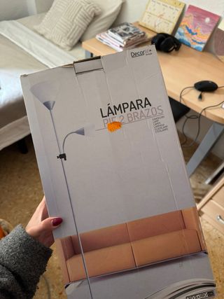 Lámpara de pie con dos brazos, ideal para iluminar cualquier rincón de tu hogar. Su diseño moderno se adapta a diferentes estilos de decoración. - Acabado en color plata y blanco. - Fabricada en metal y plástico. -Armada pero no usada -Incluye bombillas