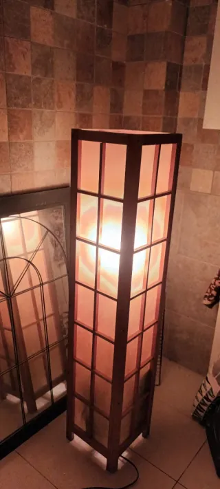 Elegante lámpara de pie con un diseño cilíndrico y acabado en madera. - Base metálica delgada. - Cable de alimentación con interruptor. Se puede quitar la base y usarla sin ella Dos bombillas Entrego en mano en Valencia