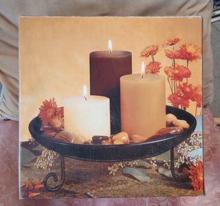 Plato cerámico sobre pié de hierro con velas perfumadas y piedras, decoración. NUEVO SIN ESTRENAR.