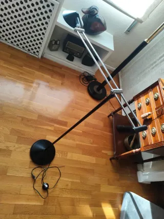 Elegante lámpara de pie con un diseño moderno. - Fabricada en metal y plástico. - Color negro. - Cabezal direccionable - Enchufe regulable intensidad de luz. - Funciona con total normalidad.