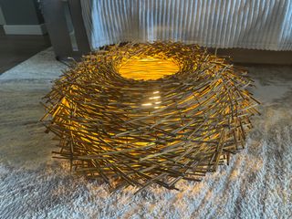 Lámpara de diseño orgánico que evoca un nido, perfecta para crear un ambiente acogedor en tu salón. - Estructura tejida con varillas de bambú. - Tonos cálidos que iluminan el espacio. - Base redonda y voluminosa.
