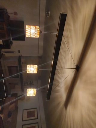 Conjunto de lámparas (dos de techo y una de pie) ideal para salón. Se encuentran en muy buen estado, salvo alguna bombilla fundida que hay que cambiar. Preferible compra en persona. MEDIDAS: -Medidas de lámpara de techo "alargada" 90x40x30 -Medidas de lámpara de techo "redondeada" 40x40x35 -Medidas lampara de pie. 167 alto x 20 CMS ancho (parte alta de las bombillas)
