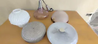 Conjunto de lámparas de techo de estilo antiguo vintage. Presentan un diseño clásico con detalles ornamentales. - Lámparas de metal dorado y plateado. - Pantallas de cristal esmerilado. - Variedad de diseños y tamaños. Las 3 por 50€. A recoger en un pueblo a 15 minutos de Burgos.