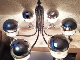 Lámpara de techo estilo Space Age, inspirada en los años 70. Lámpara araña eye ball mind century space age - Estructura metálica brillante. - Globos de cristal transparente. -( algunos de ellos están algo raspados por los años,pero inapreciable una vez colgada) Medidas en las imágenes Se envía bien empaquetada, pero no me responsabilizo de roturas por parte de la agencia de transporte. Se envía solo a españa y con correos. Sin bombillas antic, vintage, retro, new age, brocante, techo, aplic, globo, pantalla, iluminación, atrezzo, decoración, antiguo, faro, despacho, mesa, oficina, indústrial, pop art, stilno
