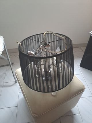 Bonita lámpara de techo con un diseño Imitando antigua. - Pantalla de tela negra. - Detalles en metal plateado. - Adornos de cristal. 3 bombillas. Entrego en mano, zona Badal o Santa Eulalia.