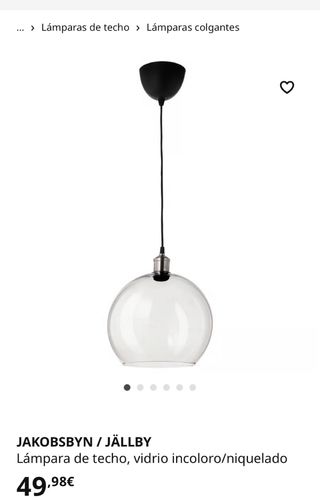 Lámpara de techo Jakobsbyn (Ikea) Diámetro 30 cm Altura 25 cm - Pantalla de vidrio transparente incoloro - Base y portalámparas de metal - Cuerda decorativa de color marrón que envuelve el cable - No incluye la bombilla Yo la tenía en la entrada con una bombilla amarilla, ¡muy bonita!