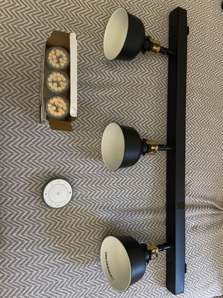 Lámpara de techo IKEA tipo barra con 4 focos orientables (puedes dirigirlos a diferentes zonas). Funciona perfectamente. Tipo de bombilla (importante): Bombillas MR16 12V, casquillo GU5.3 (2 pines) Máximo 20W por foco (según etiqueta) Incluye: Estructura completa con base y pletina/placa metálica de fijación al techo (la que se ve en las fotos, es el sistema de montaje) 2 bombillas incluidas y faltan otras 2 (se puede usar con LED MR16 12V GU5.3 también) Para recogida en mano en Barcelona, en la zona de Trinitat Nova. Precio no negociable.