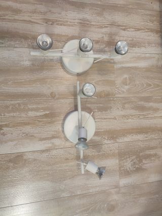 Lámpara de techo con 3 focos halogenos orientables. De metal, acabado en blanco. Es de Ikea. Incluye las bombillas que veis en las fotos. Tengo dos, las vendo a 6€ cada una.