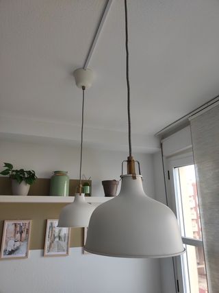 2 Lamparas de techo comedor Ikea Ranarp 23cm. No son totalmente identicos, como se ve en la foto. son de la misma serie pero de distintos años así que un pelín diferentes. sin bombilla. Cada uno por 25€ o las dos por €45. El precio no es negociable.