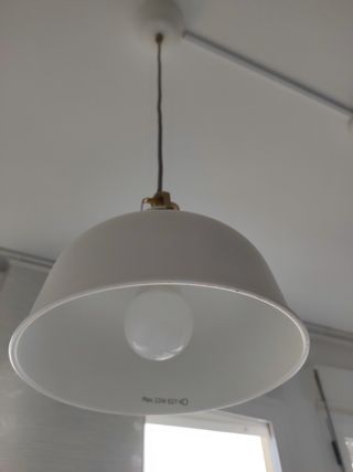 Lámpara de techo colgante, comprada en Ikea hace 5 años, la pantalla de lámparas es de forma cónica y de color arena/ cemento claro. El aplique es de color plateado. Medidas : alto de la pantalla 22, circunferencia superior 27 y circunferencia inferior 34. Está igual que cuando la compré. La vendo por 15€.