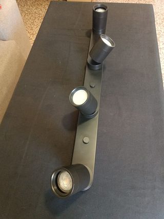 Plafón de techo IKEA modelo 19057, color gris/aluminio, con 3 focos orientables para bombillas GU10 (máx. 35W cada una). Ideal para salón, pasillo, dormitorio o estudio, ya que permite dirigir la luz según necesidad. Estructura metálica resistente y diseño minimalista típico de IKEA, fácil de integrar en cualquier ambiente. Cuenta con cableado completo (fase, neutro y toma de tierra). Estado: usado, con signos normales del paso del tiempo, pero totalmente funcional. Se entrega tal y como se ve en las fotos. Bombillas no incluidas. Perfecto si buscas un plafón práctico, orientable y de calidad a buen precio. 💡