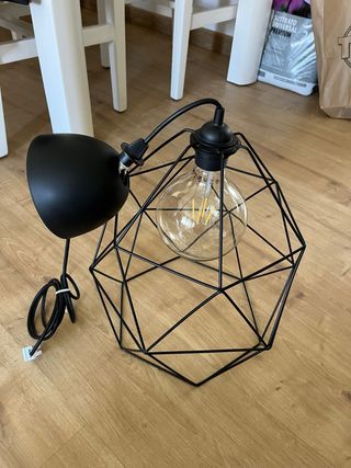 En tienda vale 25 sin bombilla,yo la vendo con la bombilla tb Preciosa lámpara de techo estilo geométrico. Ideal para darle un toque moderno a cualquier espacio. Mide 30 cm - Estructura metálica negra. - Difusor de cristal transparente. - Perfecto estado.