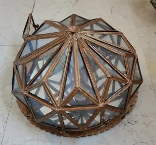 Lámpara de techo de estilo vintage con un diseño geométrico. - Estructura de metal con acabado dorado. - Paneles de cristal translúcido. - Borde decorativo festoneado.
