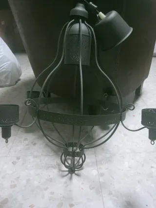 Lámpara de techo con un diseño rústico y elegante, perfecta para dar un toque especial a cualquier estancia. - Estructura de metal con detalles en dorado. - Diseño de forja con espiral central. - Tres brazos para bombillas. - No tiene las pantallas.