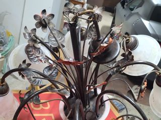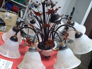 Elegante lámpara de techo con un diseño clásico y detalles cuidados. Aporta un toque de distinción a cualquier estancia. Un portalámparas hay que cambiarlo que no funciona, es resto de bombillas funcionan correctamente. - Estructura metálica. - Tulipas de cristal. - Diseño de cinco brazos.