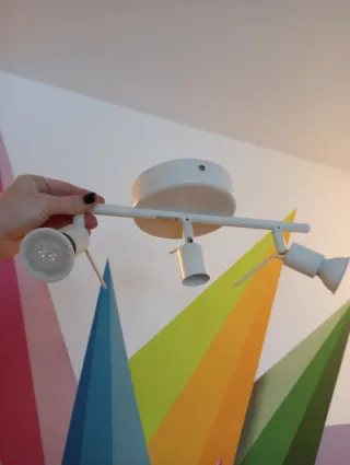 Lámpara de techo con un diseño versátil, los focos se regulan,cambiando la dirección para alumbrar las zonas que desees. Ideal para iluminar cualquier estancia. Falta una bombilla en la foto pero ya la repuse, se entrega con las 3 puestas. - Estructura metálica. - Acabado en blanco.