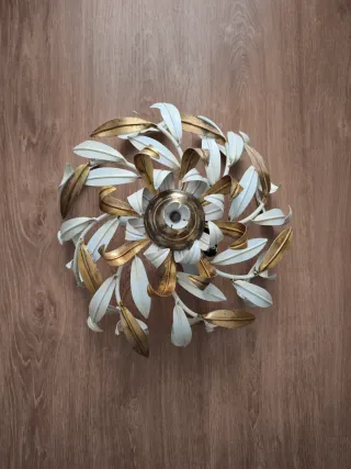 Antigua lámpara de techo tipo plafón realizada en metal pintado en dorado con pan de oro. Diseño vintage, años 50-60 Decoración vegetal con forma de hojas alternas. Instalación eléctrica con 4 casquillos Ideal para un salón, pasillo o dormitorio Mide 18'5cm alto. 44'5cm diametro VDV3302 Fase lupela kartell Hollywood regency Hispania retro sol antiguo antigüedad Romeo Rega wassily cesca subasta Willy Rizzo espejo ferroart manises nórdico escandinavo metalarte Manises retro Foster Corbusier altar space age vitra helecho bronce aplique lumica zara kave home cesca Gaetano Sciolari Kartell Ikea latón Luis XV óleo luz Bondia veneciano
