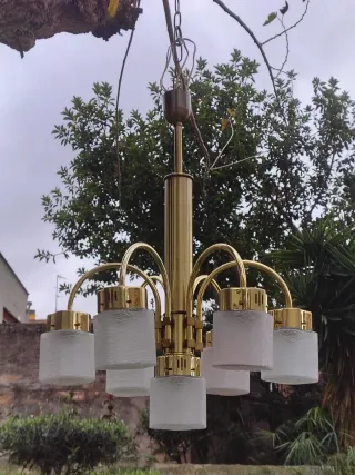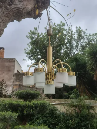 Lampara vintage con cuerpo dorado en buen estado y un nivel con 6 tulipas con cristal hilado y otra central en nivel inferior. Portalámparas de tamaño grande Medidas: 72 cms de alto x 56 CMS de diámetro aproximadamente Bombillas de casquillo pequeño. instalación eléctrica revisada En buen estado. Envíos a través de Correos Wallapop. Preguntar antes de comprar Instalación eléctrica revisada space age modernista art deco NOUVEA fase retro pop. Bondia Hispana Cartuja flexo arquitecto italiano Manises cerámica RETRO ANTIGUO MID CENTURY DISEÑO INDUSTRIAL ANTIGUA ANTIGÜEDAD AÑOS 50 60 70 80 ikea
