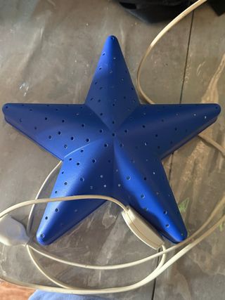 Preciosa lampara en forma de estrella de Ikea. Es de color azul y esta fabricada en plástico. - Perfecta para una habitación infantil. - Tiene pequeños agujeros que permiten que la luz se filtre de forma bonita. - Incluye cable y interruptor.