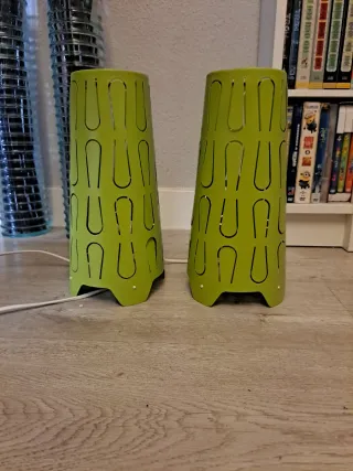 Par de lámparas de mesita con un diseño único y moderno. - Estilo vintage. - Fabricadas en metal. - Color verde vibrante.