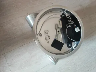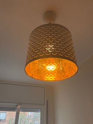 Lámpara colgante con un diseño moderno y elegante. Es la primera versión, descatalogada. No incluye bombilla. A recoger en Badalona centro. - Estructura metálica con acabado blanco. - Patrón perforado que crea un juego de luces. - Interior con acabado dorado.