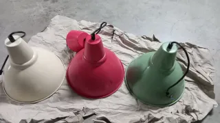 Set de tres lámparas de techo de metal de Ikea. Cada lámpara tiene un color diferente: beige, rosa y verde. - Diseño moderno y versátil. - Fabricadas en metal resistente. Una de ellas abollada, y no todas con el embellecedor de arriba